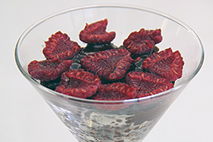 Take the dessert dish with the rice crisp from the fridge and add a first layer of chocolate mousse. Add the raspberries, halved to bring out their full flavour (picture 4) and top with the rest of the mousse (picture 5).